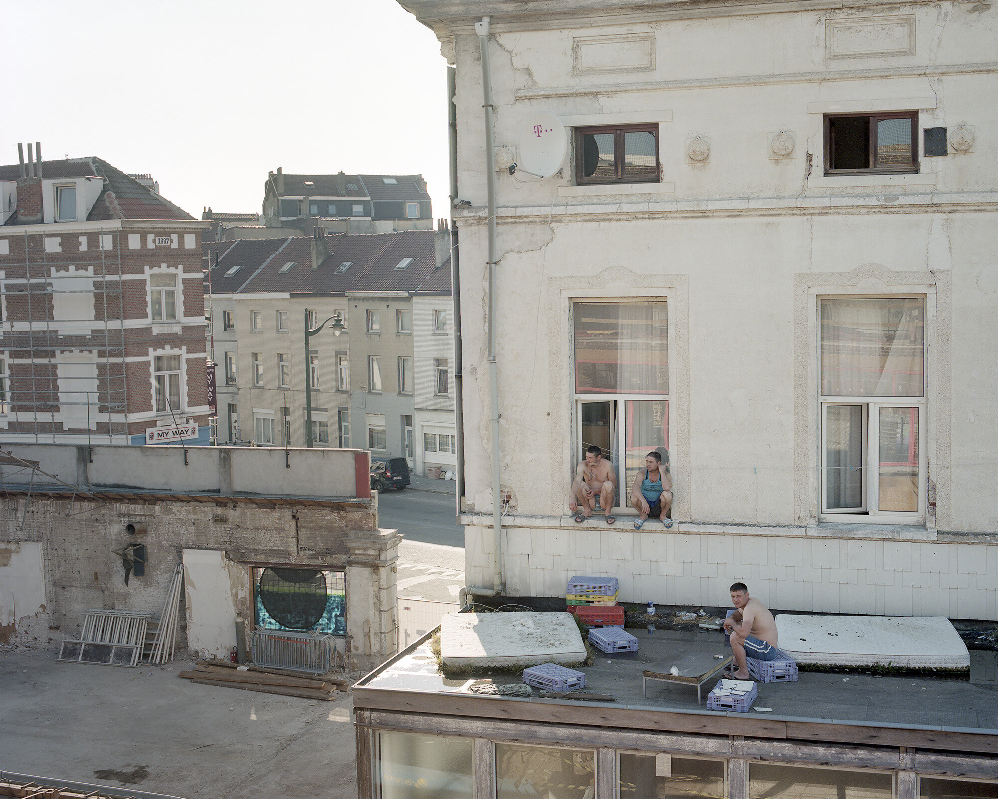 Au sud d’Anderlecht se trouve le Quartier Aurore, une succession de sept immeubles construits dans les années soixantes en face du canal bruxellois. Ce lieu nous attirait sans que l’on puisse expliquer pourquoi. Peut-être sa verdure, son terrain de foot, le Gentleman - seul bar des environs - fermé depuis un moment, son allure d’une autre époque. Tout autour, les anciennes zones industrielles délaissées se transforment à présent en projets immobiliers. Le Quartier Aurore sera lui aussi amené à changer dans les prochaines années. En attendant, le quotidien suit son cours.